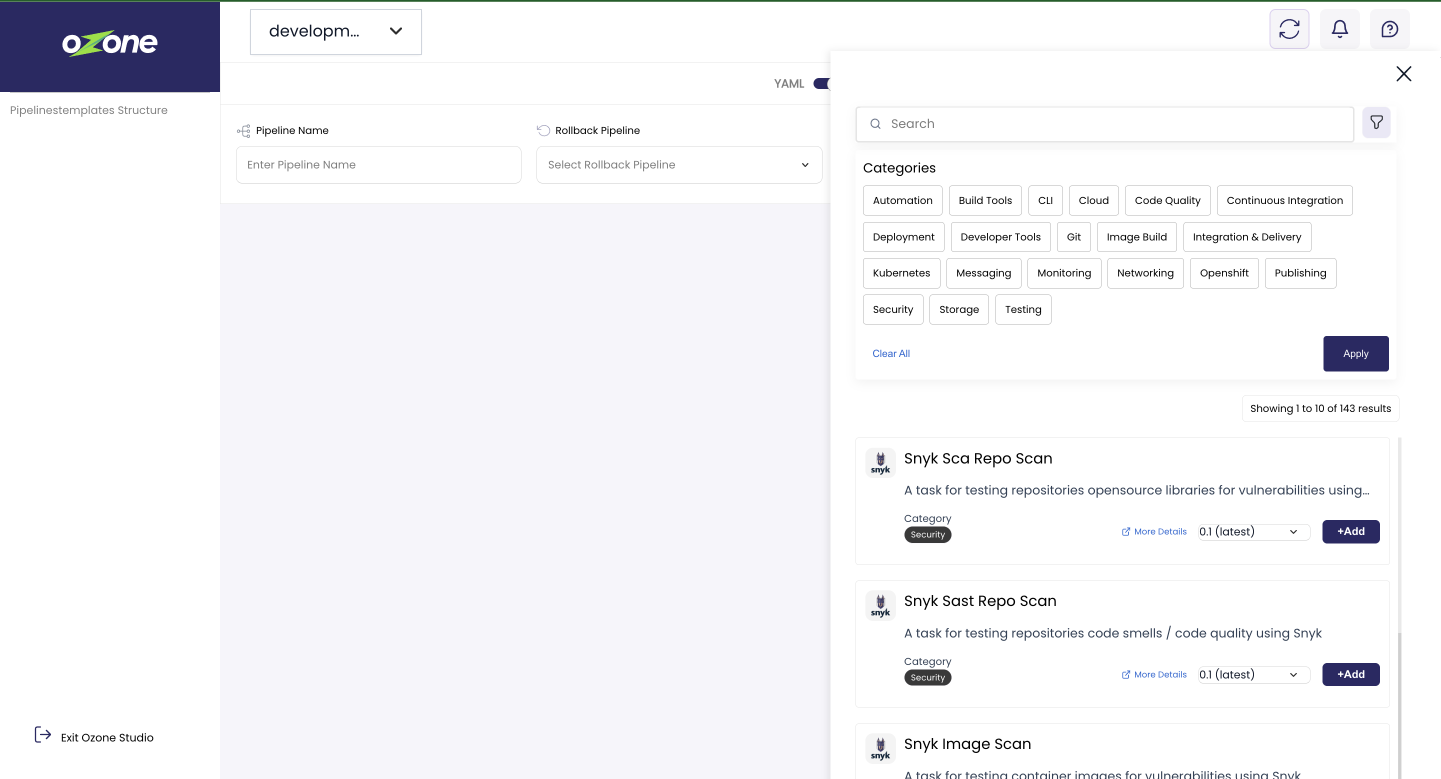 After filling in all these, Now we can see there is a button called **+Add Tasks,** if we click on that we can see there are tasks that we have created in the previous step as well as well as the featured tasks that are offered by ozone.