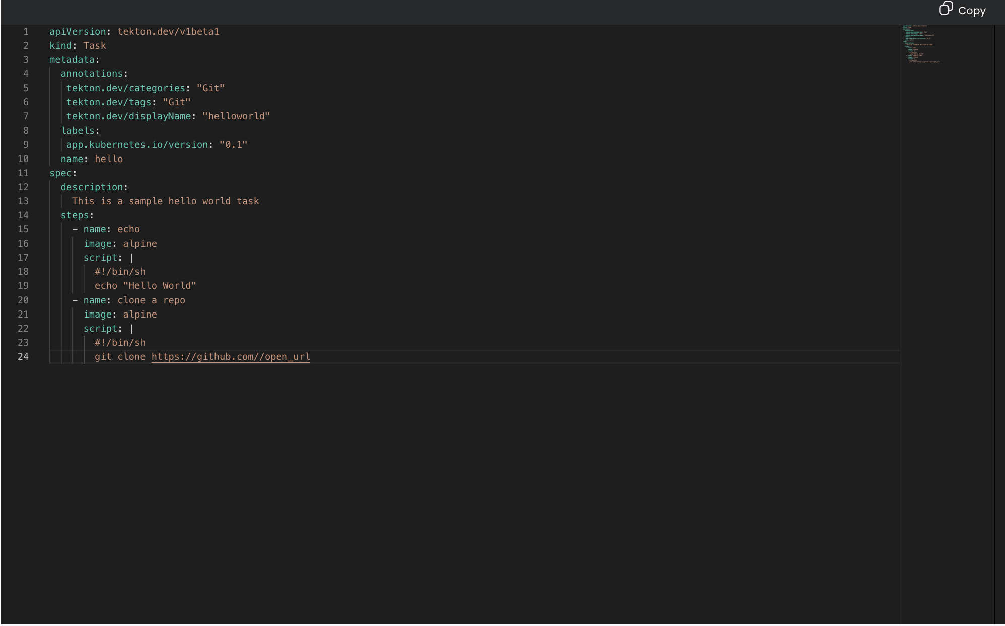 Initially, we sample a template for printing “hello world” once you get to know the syntax and what params are necessary for a valid task template. you can customize your own task and add you steps as shown below(clone a repo)<br>