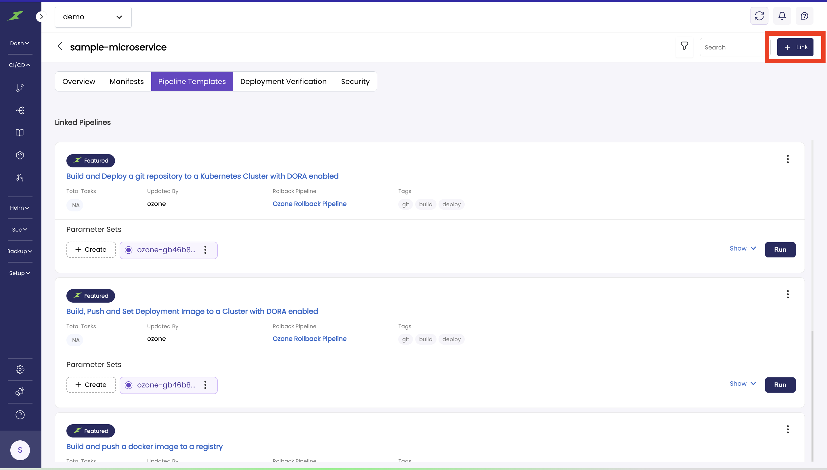 Navigate to the "Pipeline Templates" tab within the microservice and click on "Link" at the top right corner.