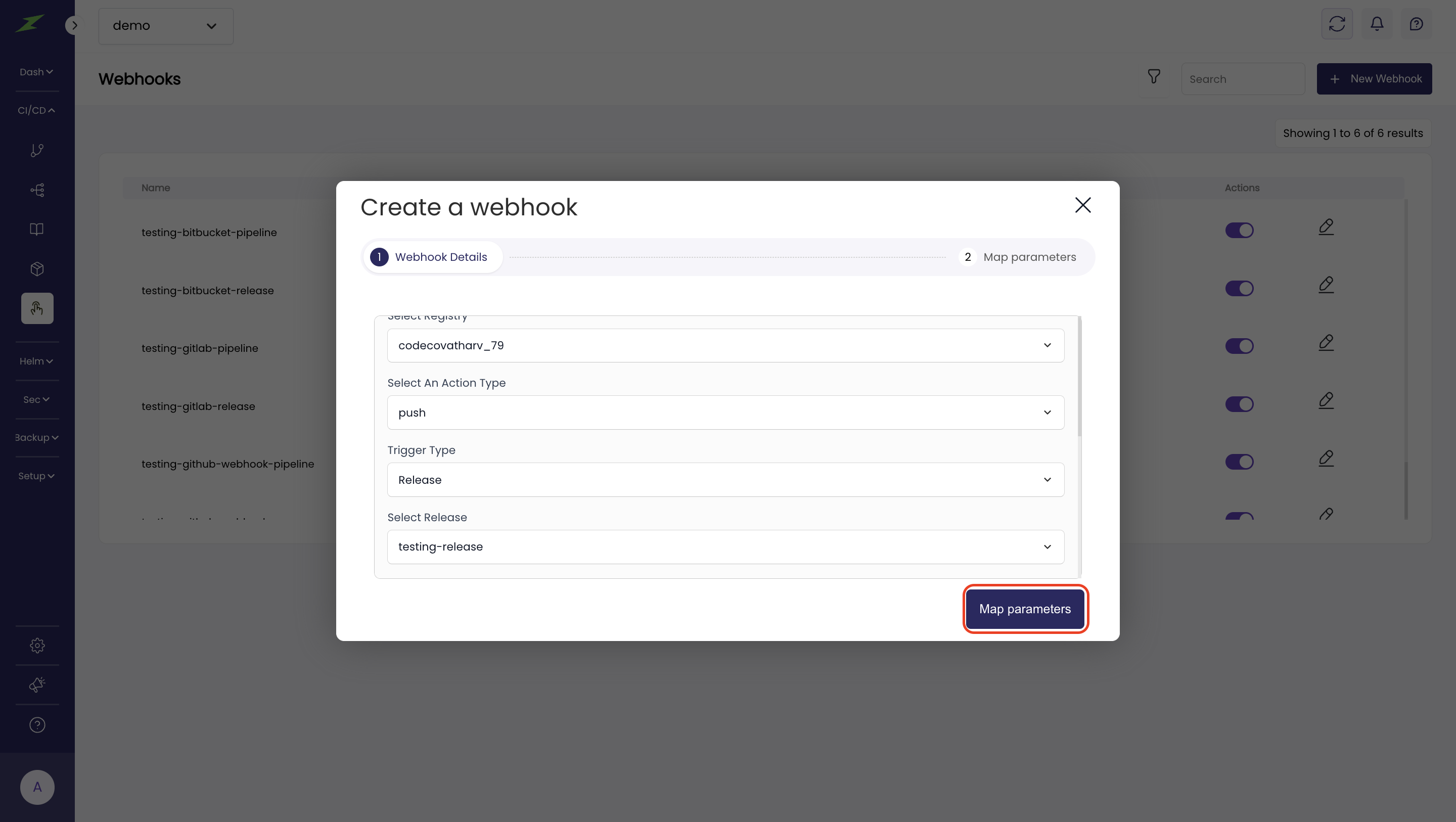 1. On click of the **create webhook** button, a modal window appears in which we can enter the details for webhook creation