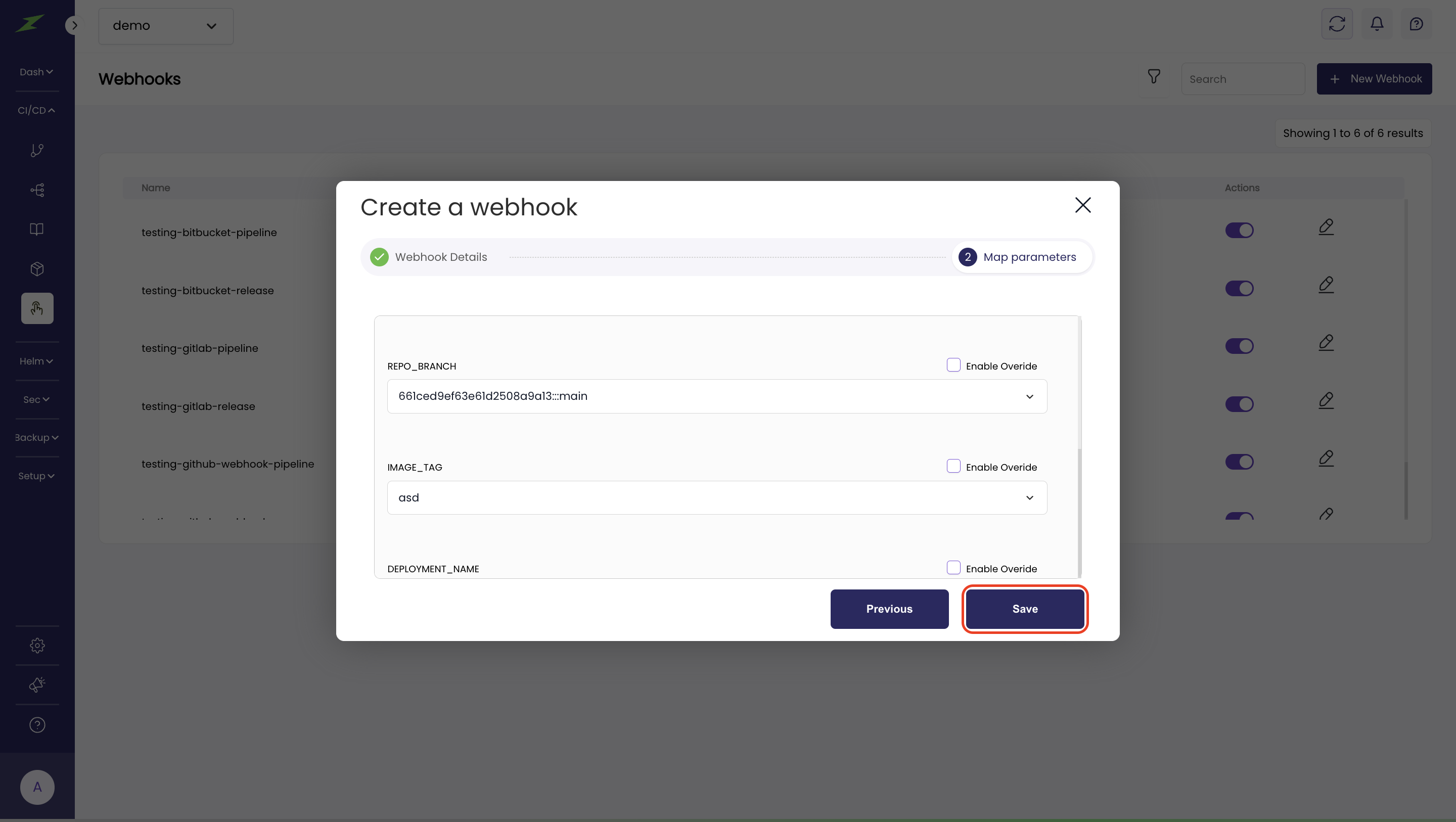 8. Once all this is done, users can click on the **Save** button to create the webhook for the pipeline.