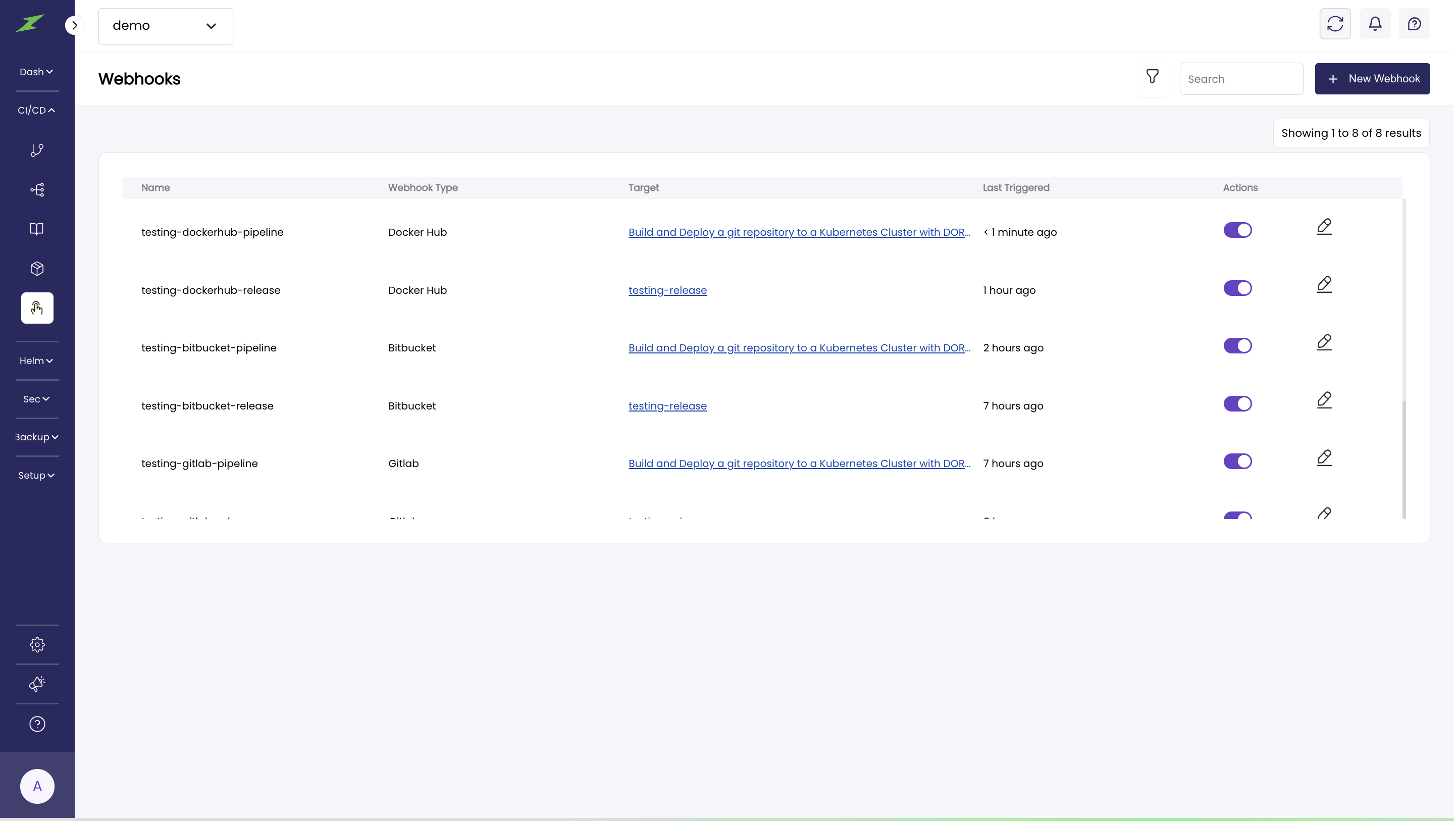 Users can click on the edit button to edit the webhooks, click on the toggle button to enable/disable the webhook, and as it is seen from the webhook type that it is a Dockerhub webhook.\