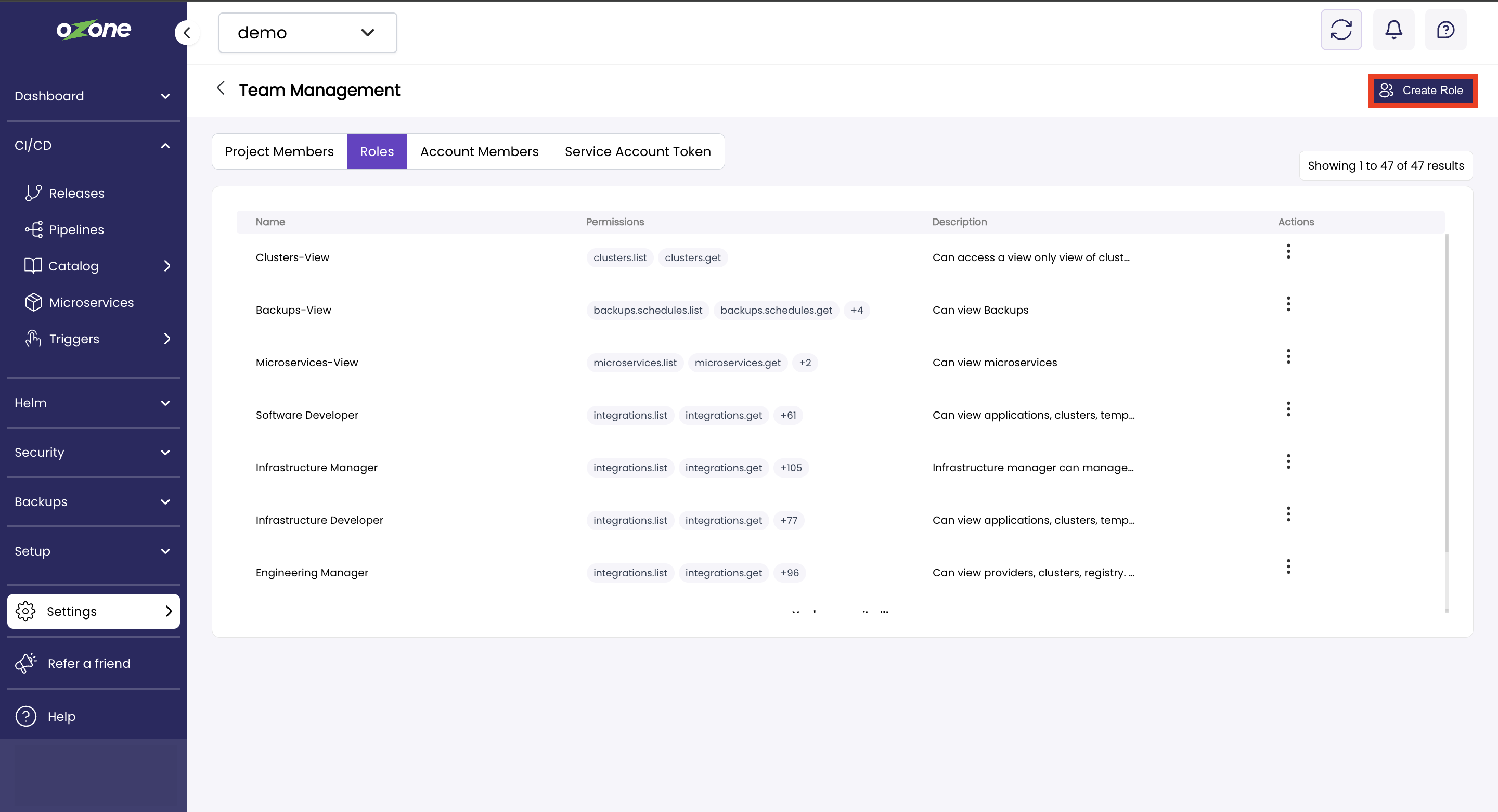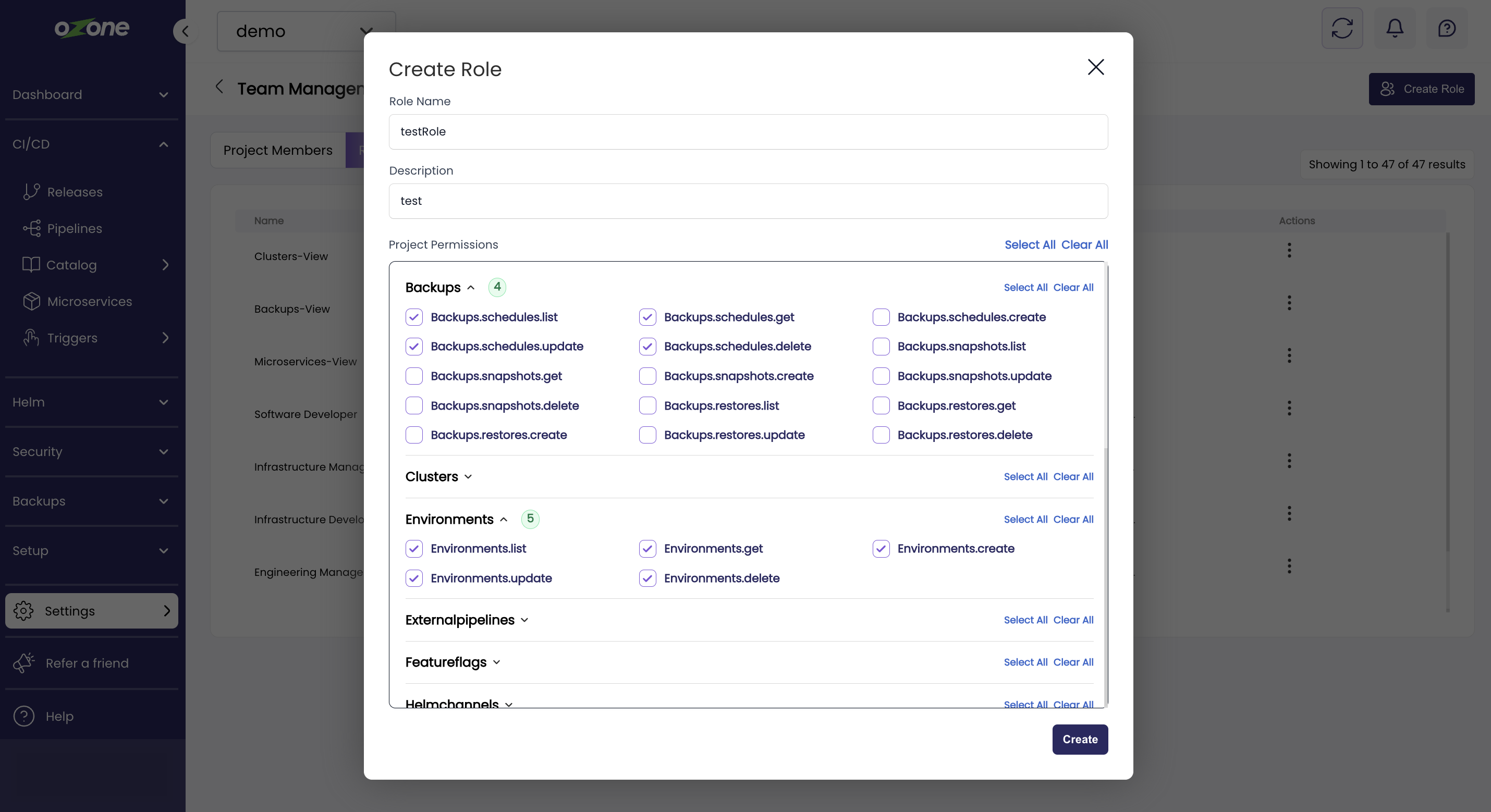 A Modal window will open with the list of all the features and resources such as Backups, Clusters, HelmChannels and so on. Each Feature will have List, Create, Update, and Delete permissions which the admin user can select by clicking on the checkbox next to the permission.