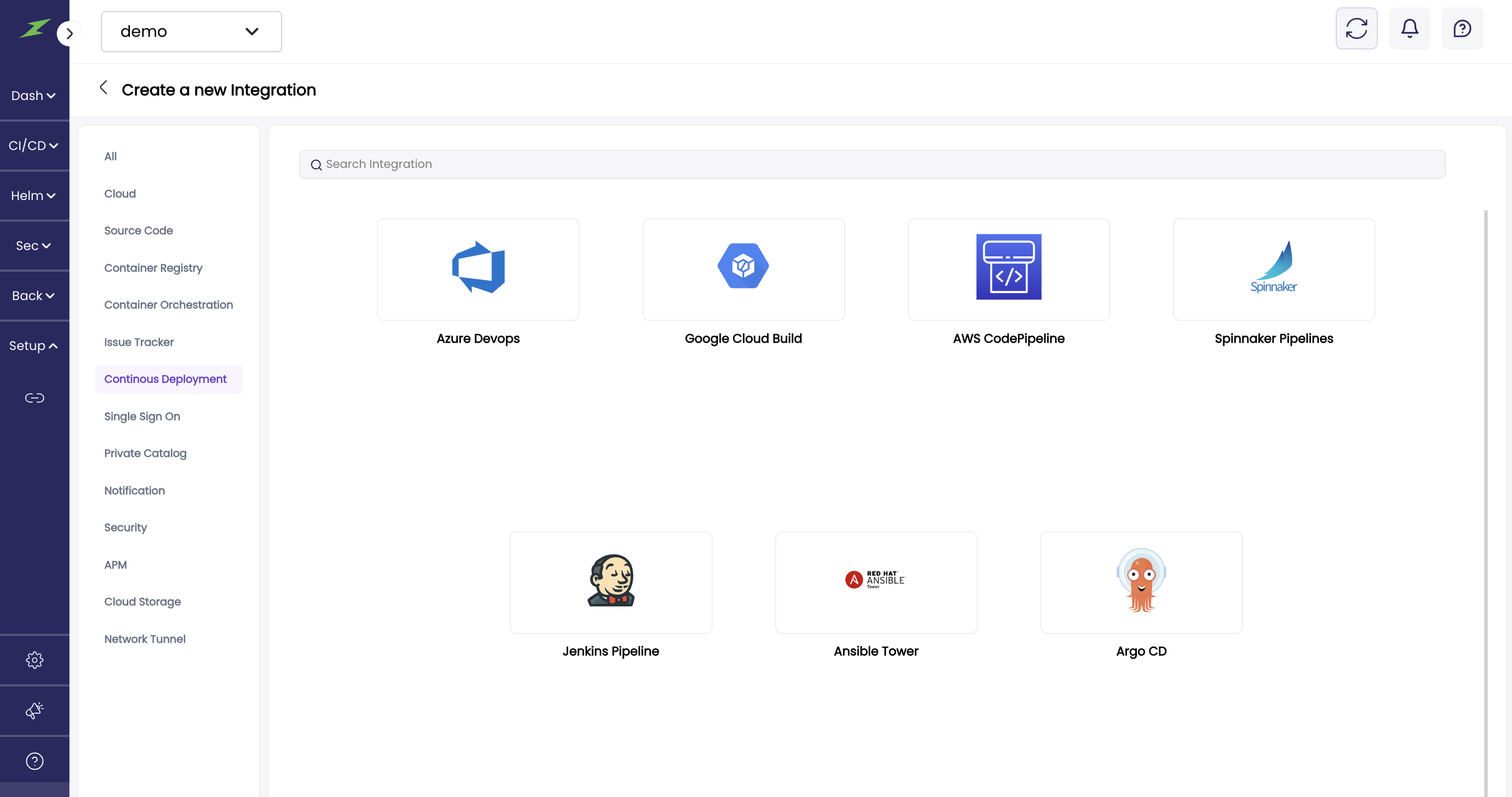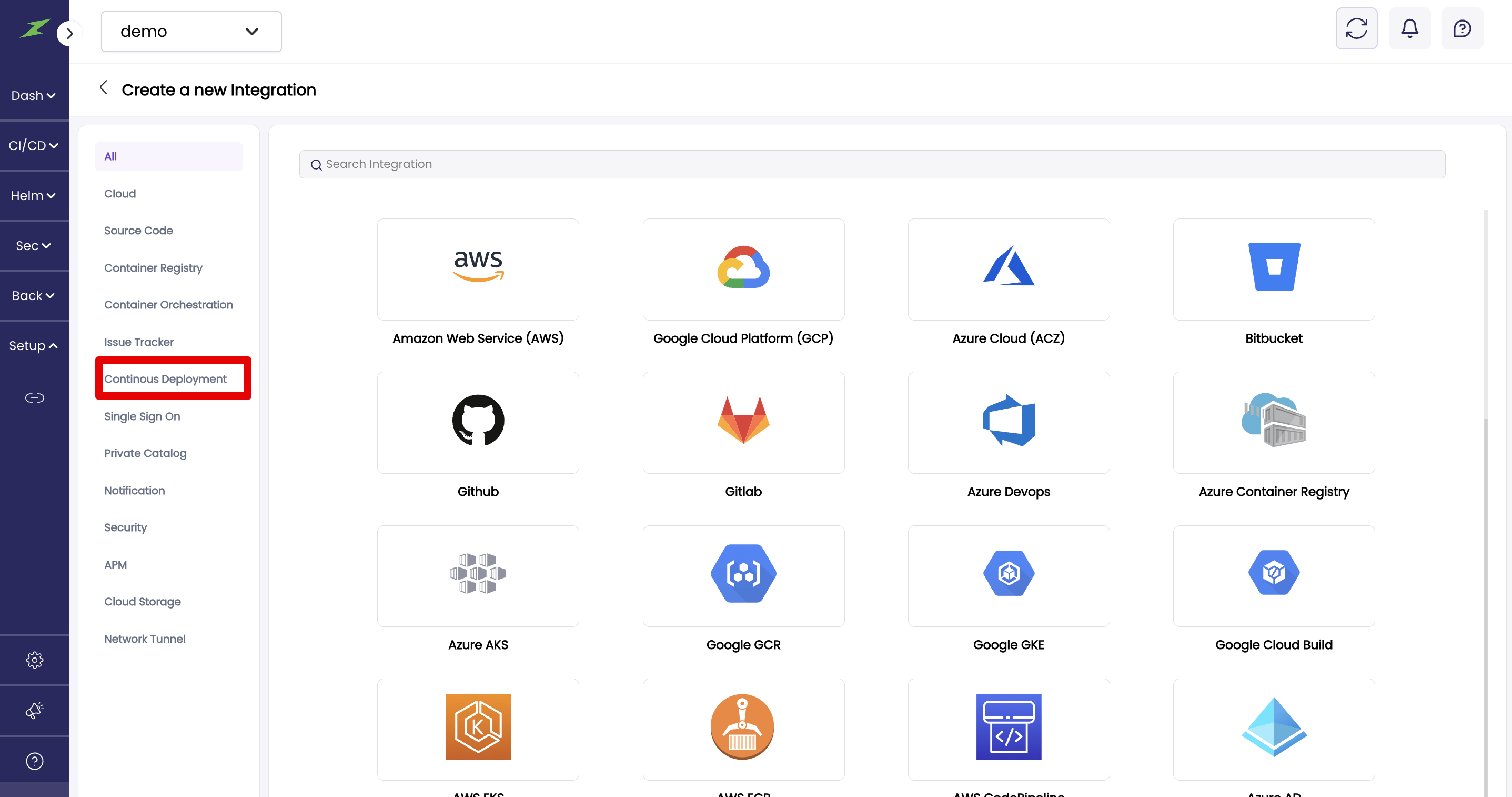 1. Click on the subcategory **Continuous Deployment** to create a cloud integration, as shown below