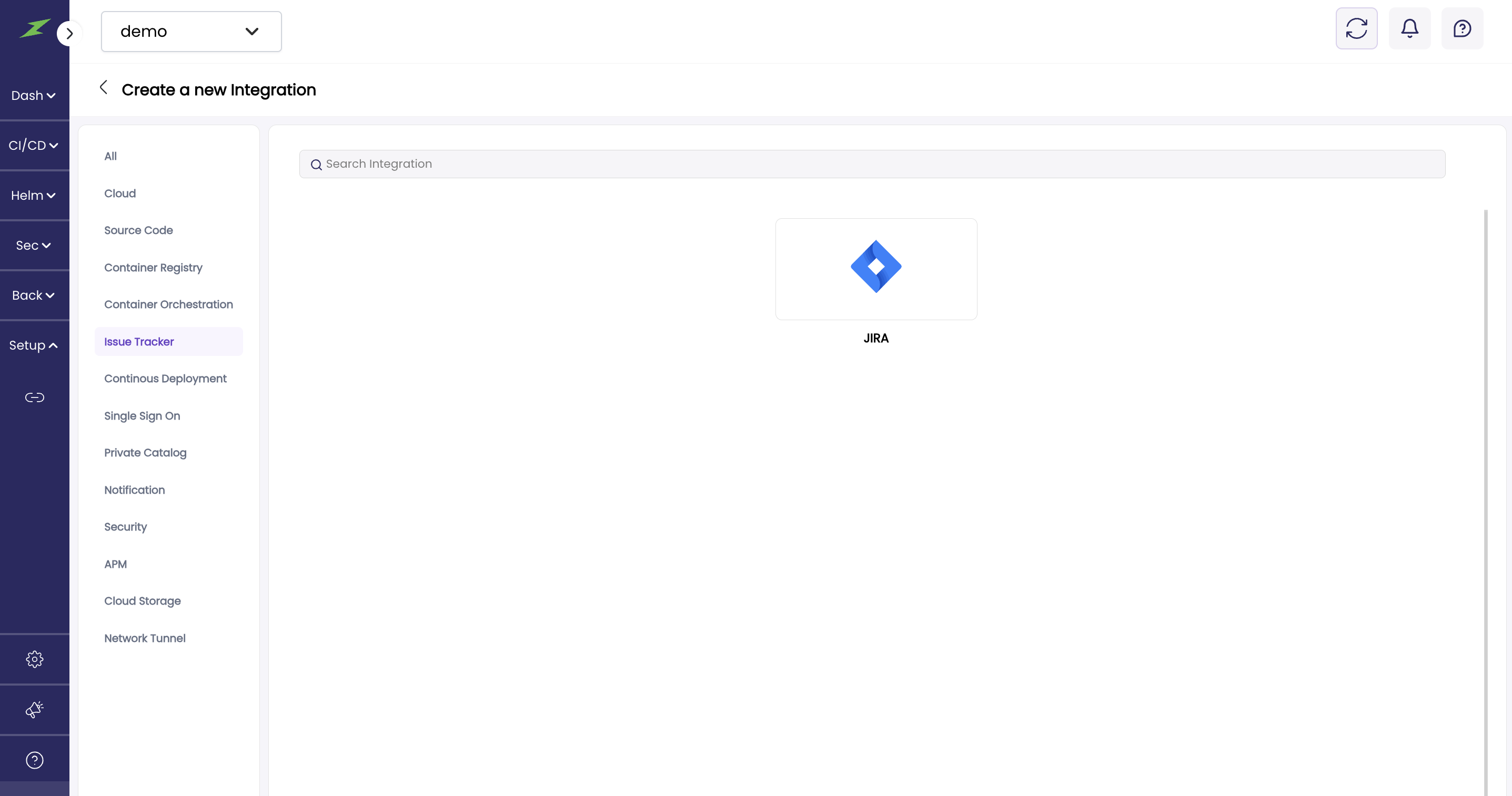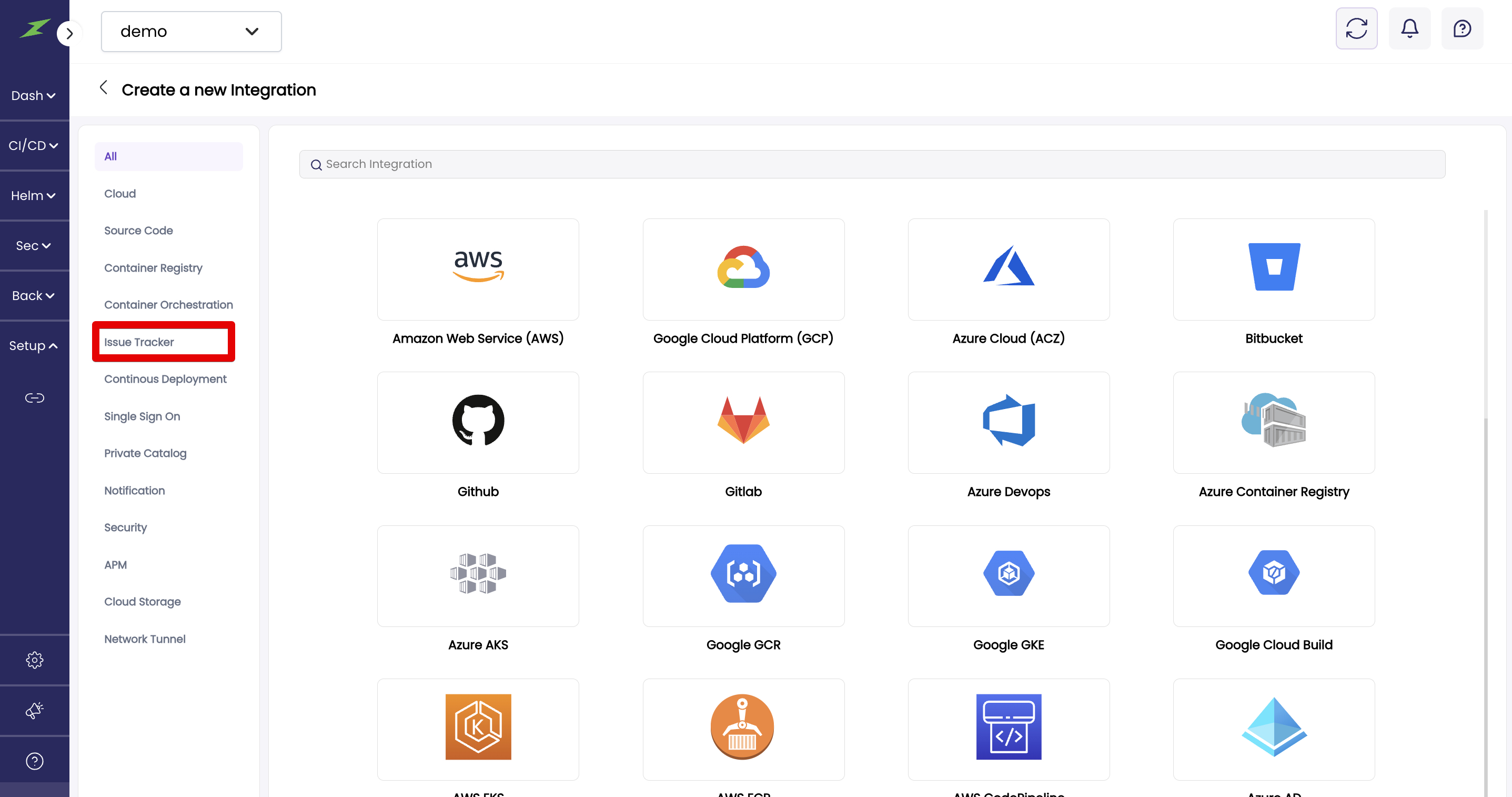 1. Click on the subcategory **Issue Tracker** to create a cloud integration, as shown below
