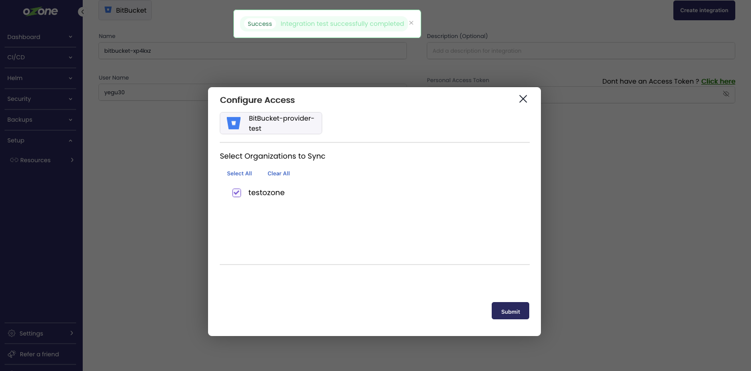 Once the credentials are verified a modal window is shown to choose the organisations you want to integrate to Ozone.